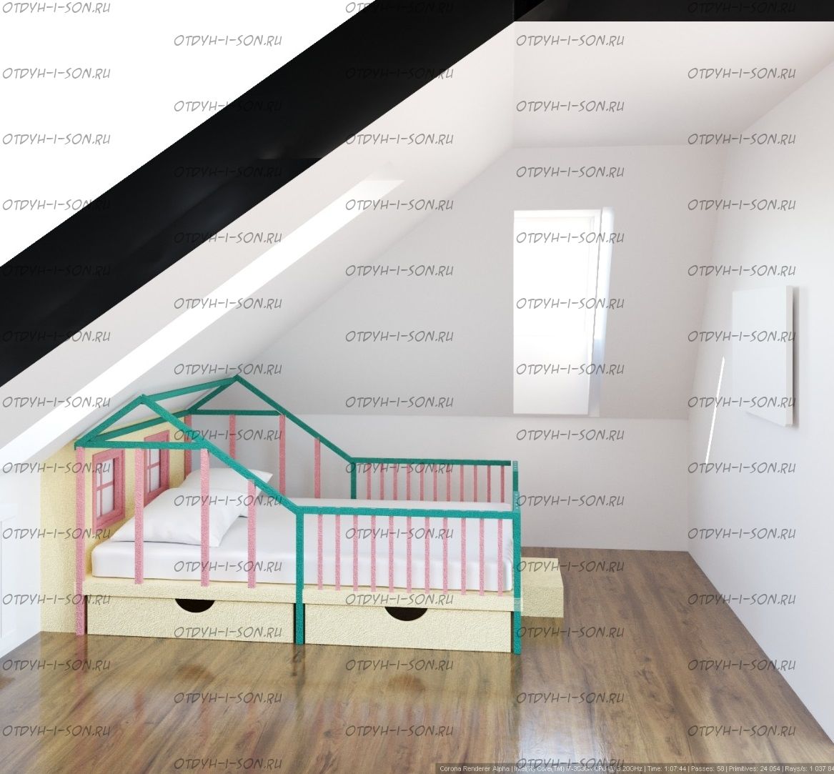 Кровать Домик угловой Butterfly Мансарда №4. Данная кровать может быть выполнена с учетом любых Ваших пожеланий, мы изготавливаем данную угловую кровать домик с различными ящиками, полочками, бортиками или без них. Крышу кровати домика также можно сделать симметричной или ассиметричной при желании. Мы покрываем наши изделия только качественными, нетоксичными красками.